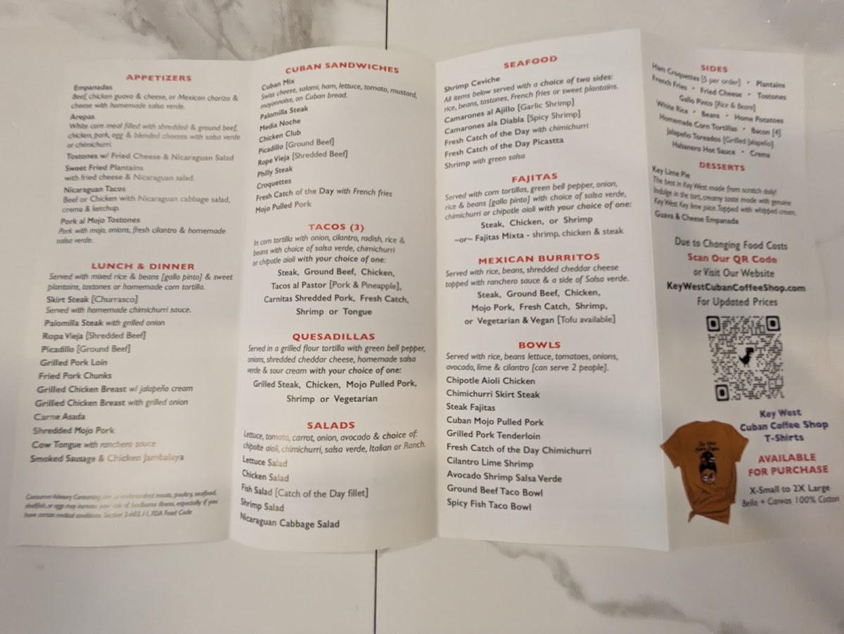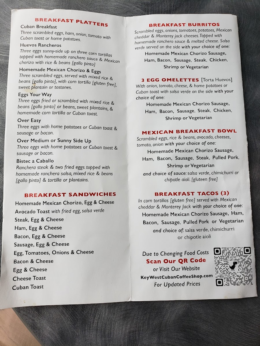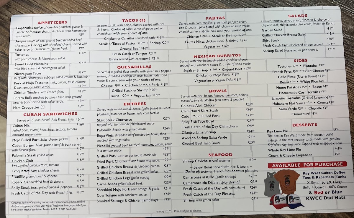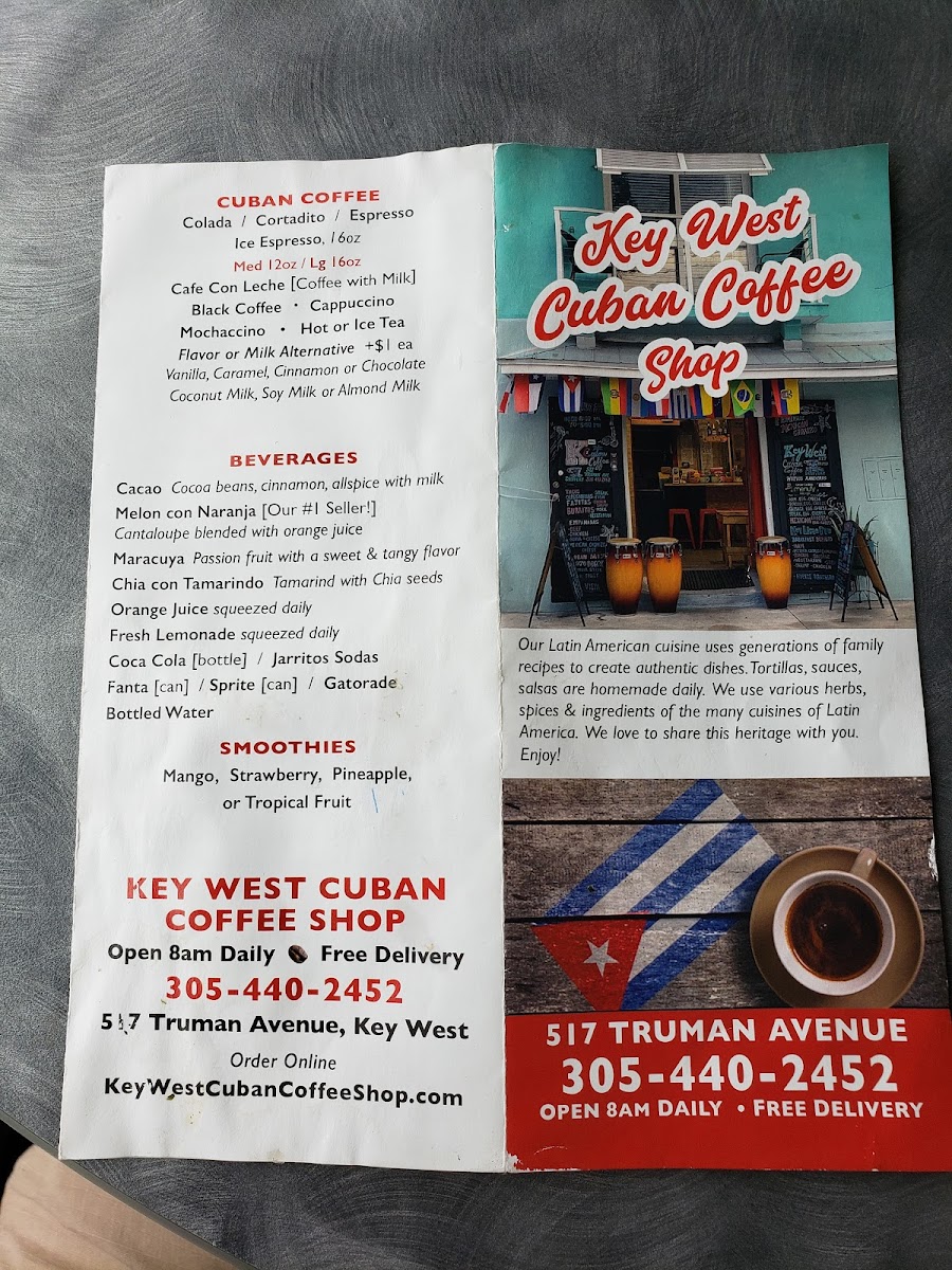 Welcome to Key West Cuban Coffee, a delightful café nestled at 517 Truman Ave, Key West, FL. This vibrant eatery serves an array of authentic Cuban dishes that will tantalize your taste buds. Their breakfast menu features standout selections like the Breakfast Bacon Burrito with scrambled eggs, Monterey Jack cheese, and ranchero sauce, all served with zesty salsa verde. Lunchtime favorites include the aromatic Carne Asada and the hearty Chicken & Smoked Sausage Jambalaya, accompanied by traditional sides like sweet plantains and homemade tortillas. Diners rave about the generous portions and bold flavors, making it an unbeatable choice for breakfast or lunch. Don't miss the famous Key Lime Pie, praised as the best in Key West! With friendly service and a relaxing atmosphere, Key West Cuban Coffee is a must-visit destination for both locals and visitors alike, promising a memorable culinary experience.